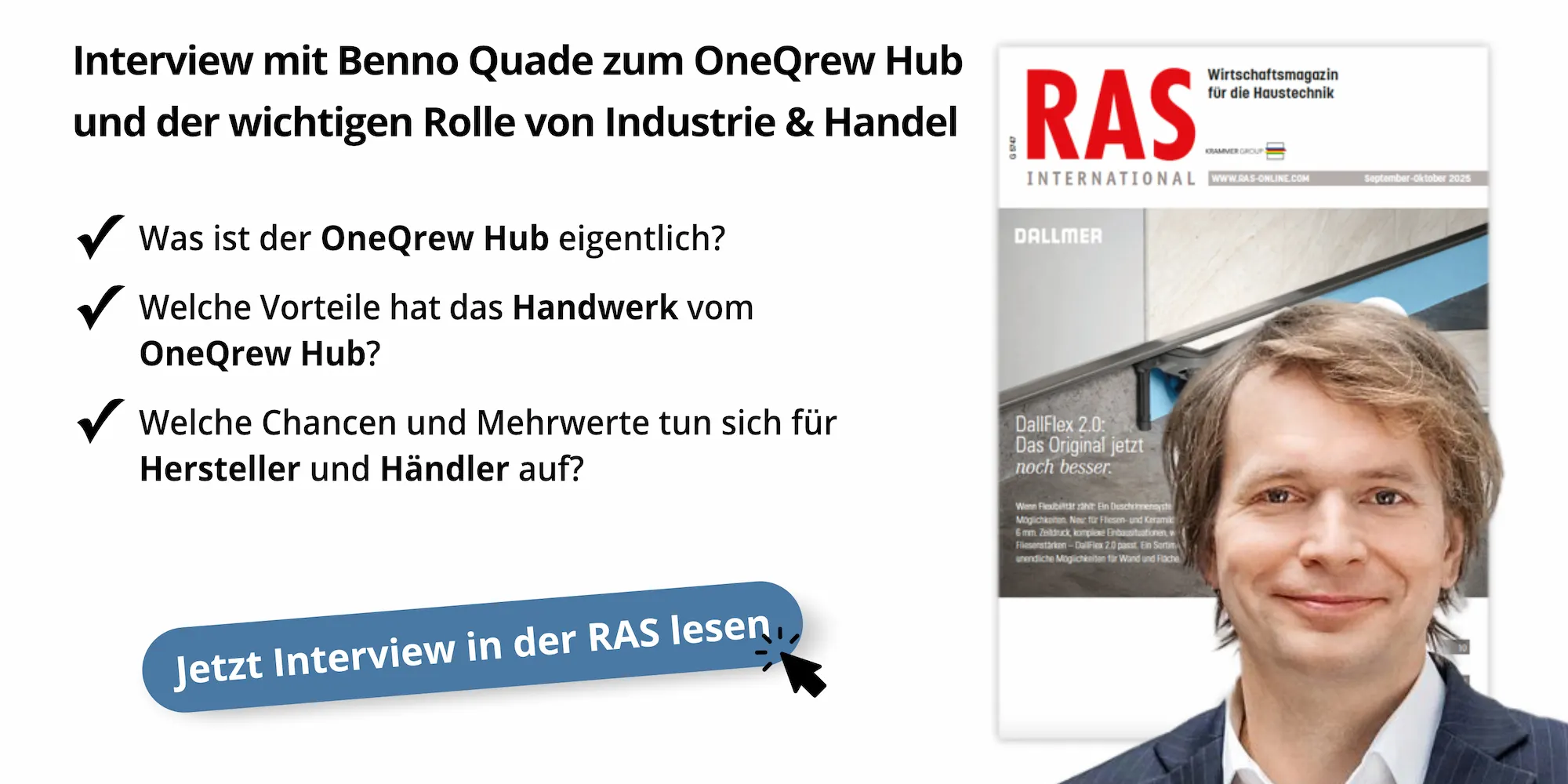 Im Interview mit dem RAS-Magazin erklärt Dr. Benno Quade, Co-CEO der OneQrew, wie der OneQrew Hub auf Basis der OXOMI-Technologie Produktinformationen direkt in die Handwerker-Software bringt. Sie erfahren, wie auf diese Weise echte Mehrwerte für Industrie, Handel und Handwerk entstehen.
